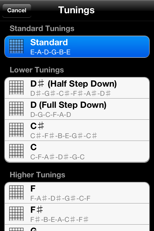 A total of 45 different tunings are included: standard, lower (D# half step down, D full step down, C#, and C), higher (F, F#, G, and G#), dropped (drop D, C#, C, B, A#, and A), double dropped (double drop D, C#, C, B, A#, and A), major open (open A, B, C, D, E, F, and G), minor open (open A, C, C#, D, E, and G minor), extended chord (open A, C, D and E minor7, open C, D, E, and G major7), and miscellaneous (Dsus4, DADDAD, all fourths, and all fifths).