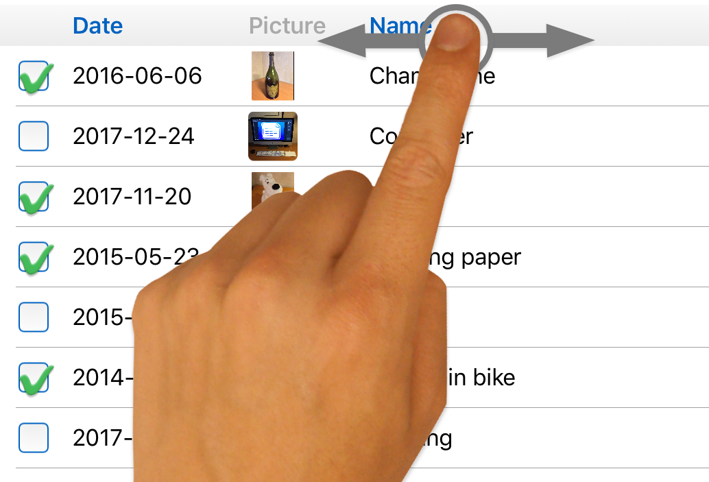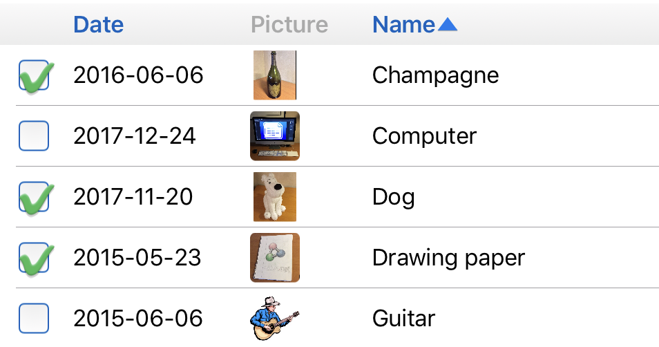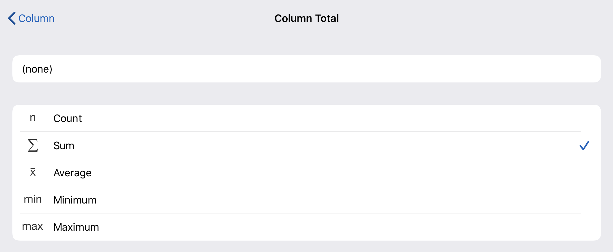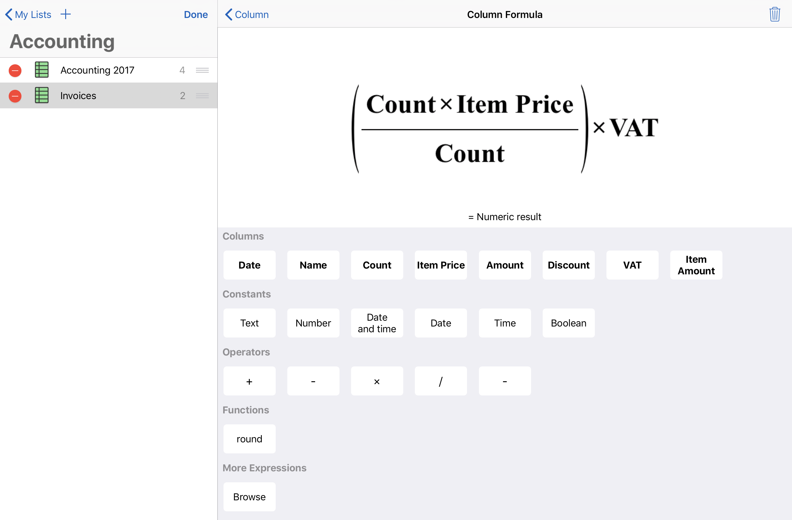 Columns support formula expressions to automatically calculate values. Expression are created using the graphical formula editor. Additional expression and functions may be added with in-app purchases.