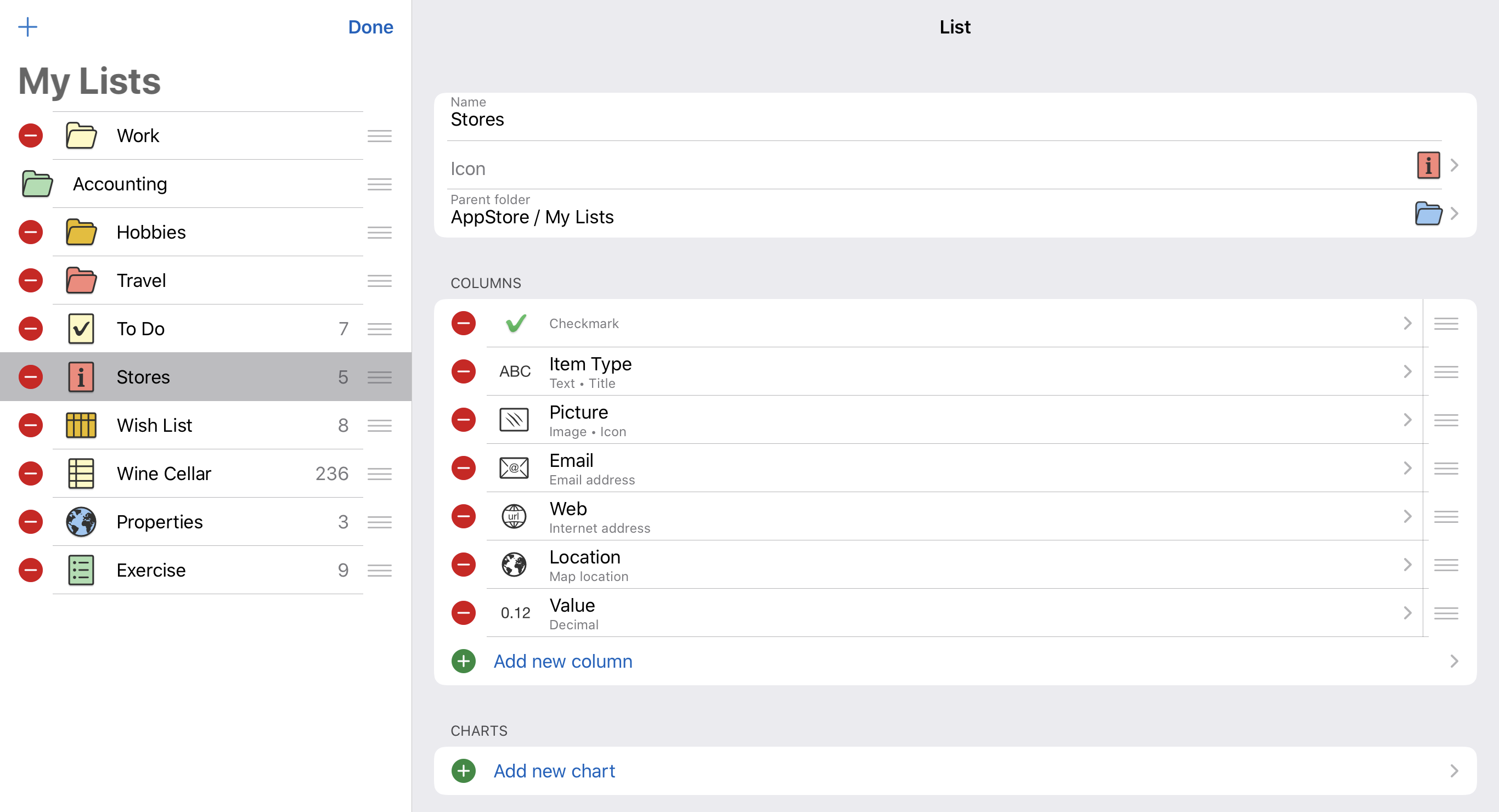 Design your lists by specifying the name, icon (predefined icons or your own pictures in your library), columns and charts.