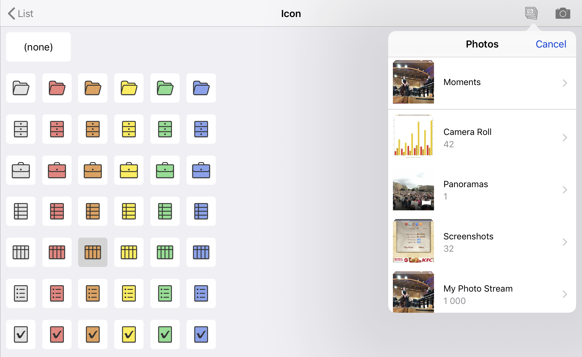 Set predefined icons or use your own photos or images as icons for lists and folders.