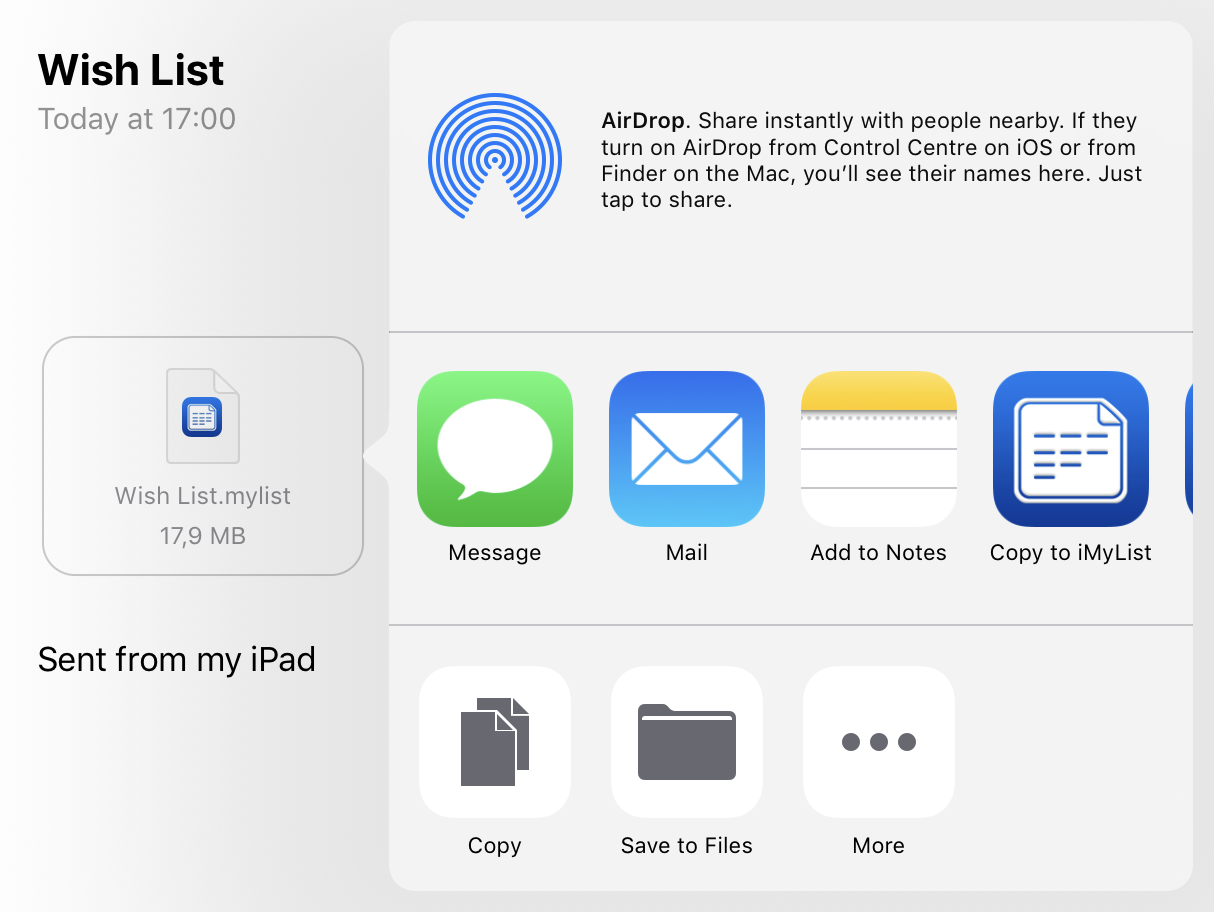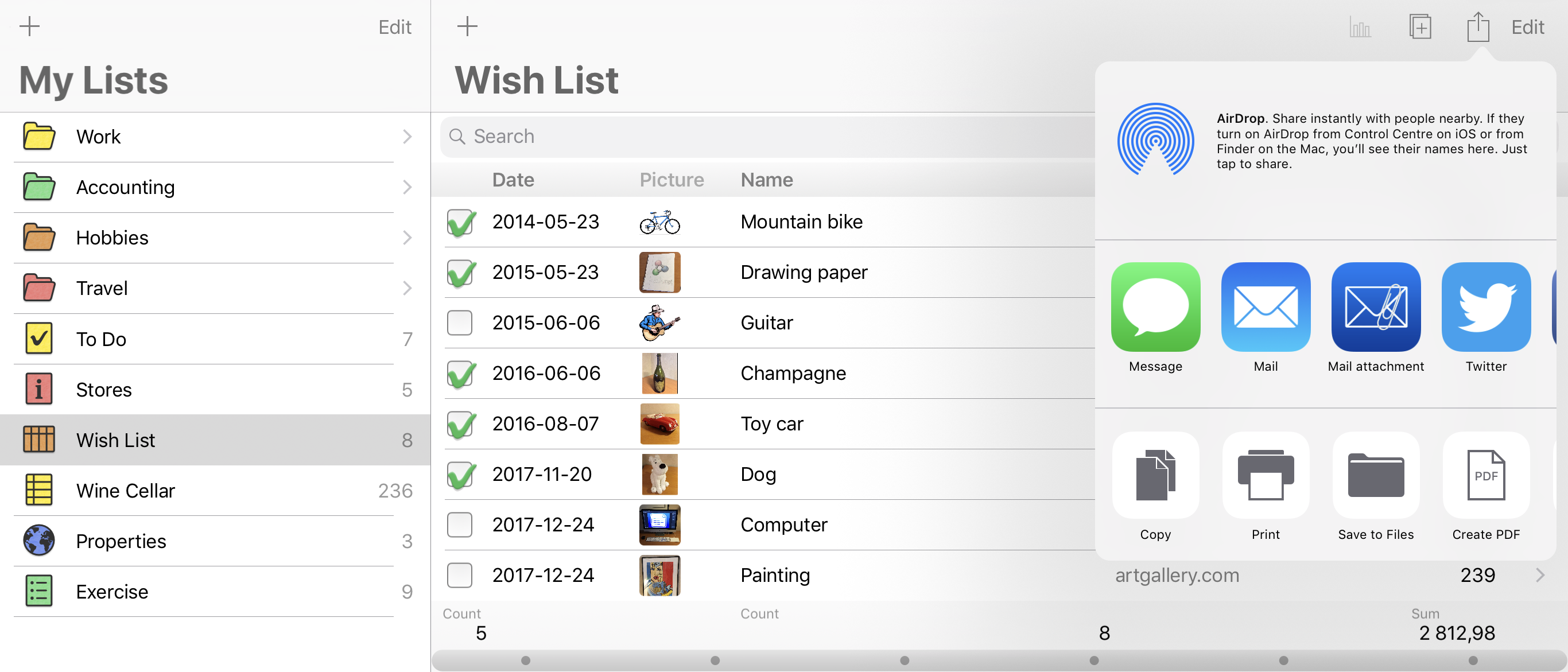 Share lists using AirDrop, Mail, Messages, Facebook, or Twitter, among others. You can also print, export to files and create pdf files.