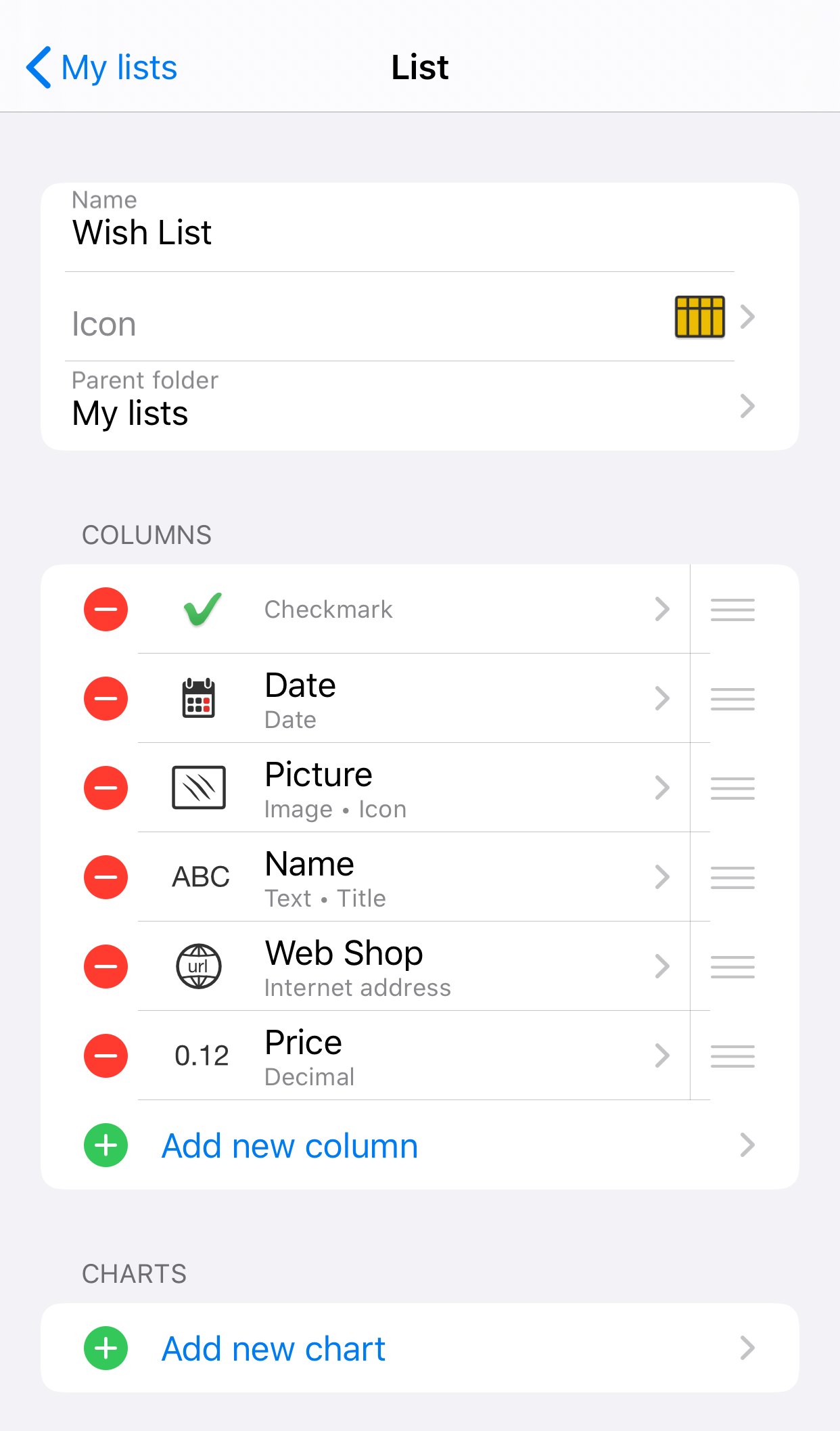 - Swipe a chart item to the left and then tap the Delete button to delete it.