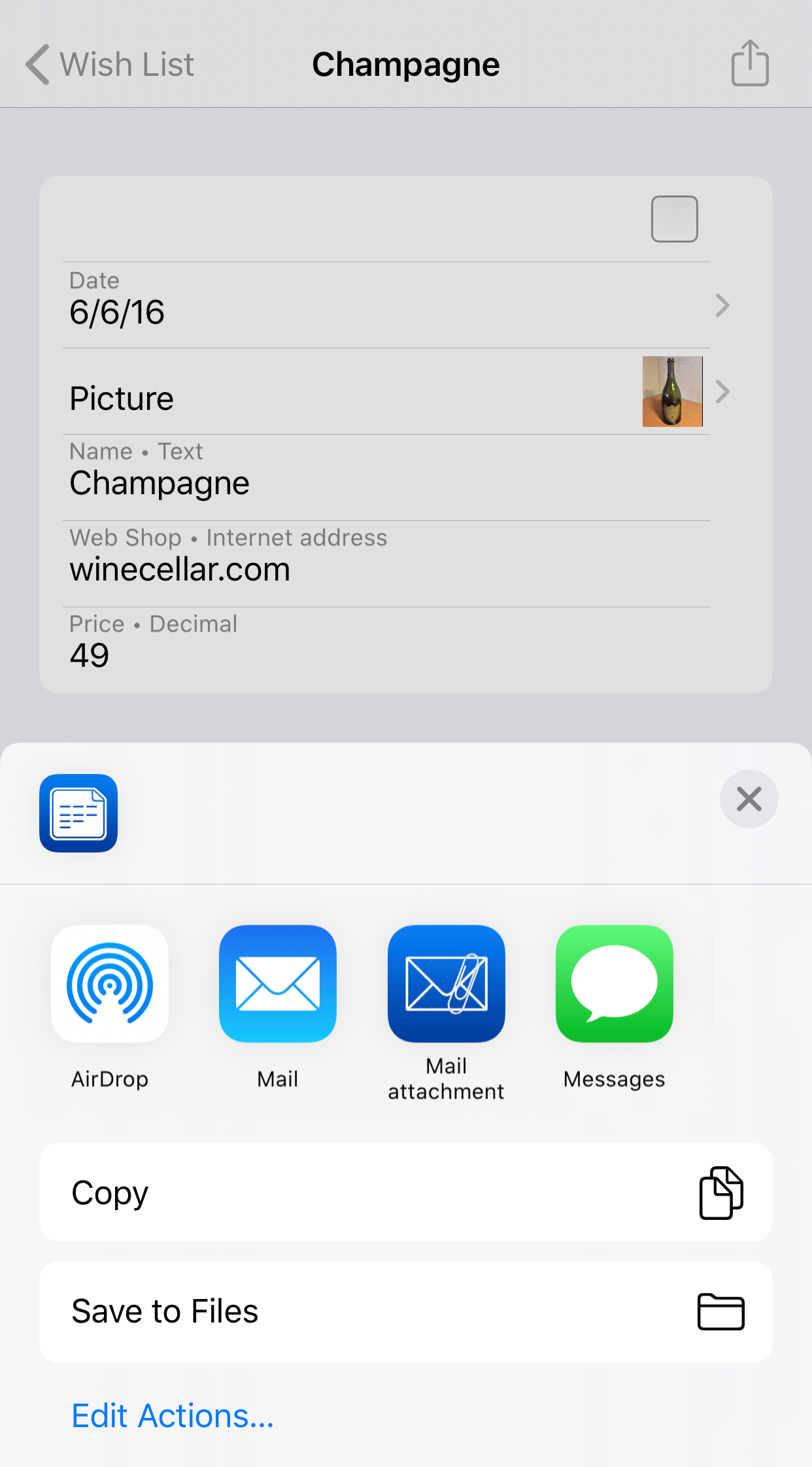 - Mail – the row contents are sent to the Mail app as the body of a new mail message. Enter the name of the recipient and tap the Send button to send the row.